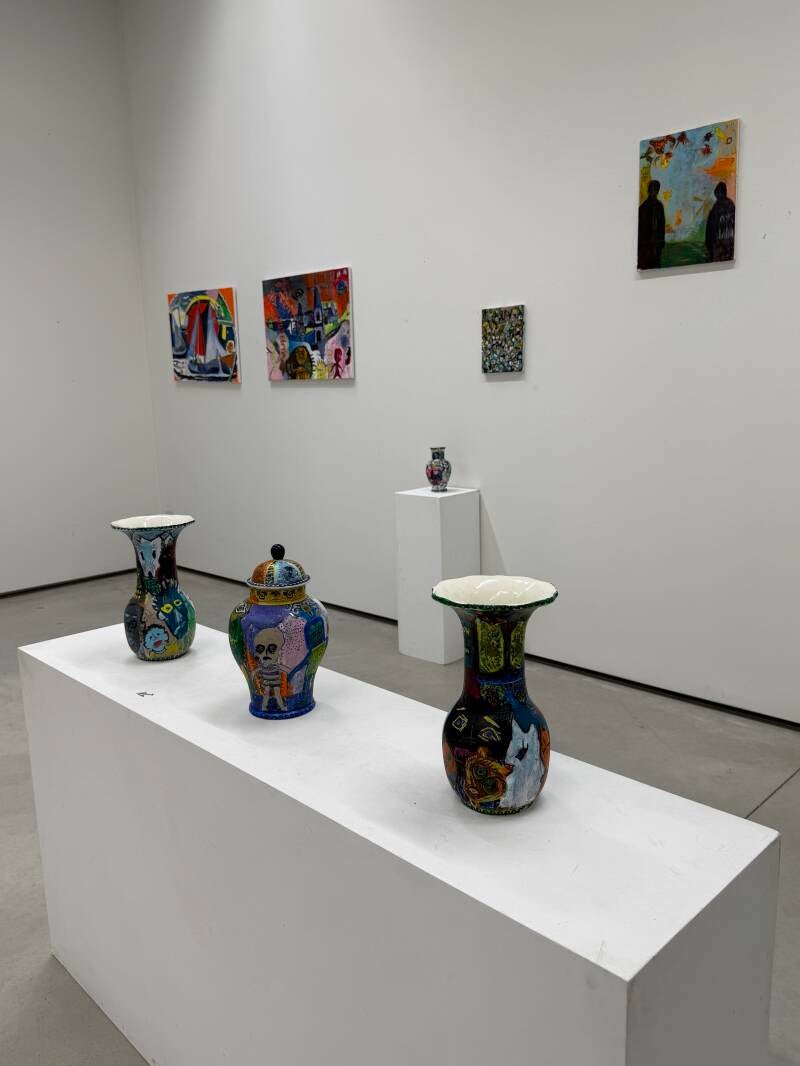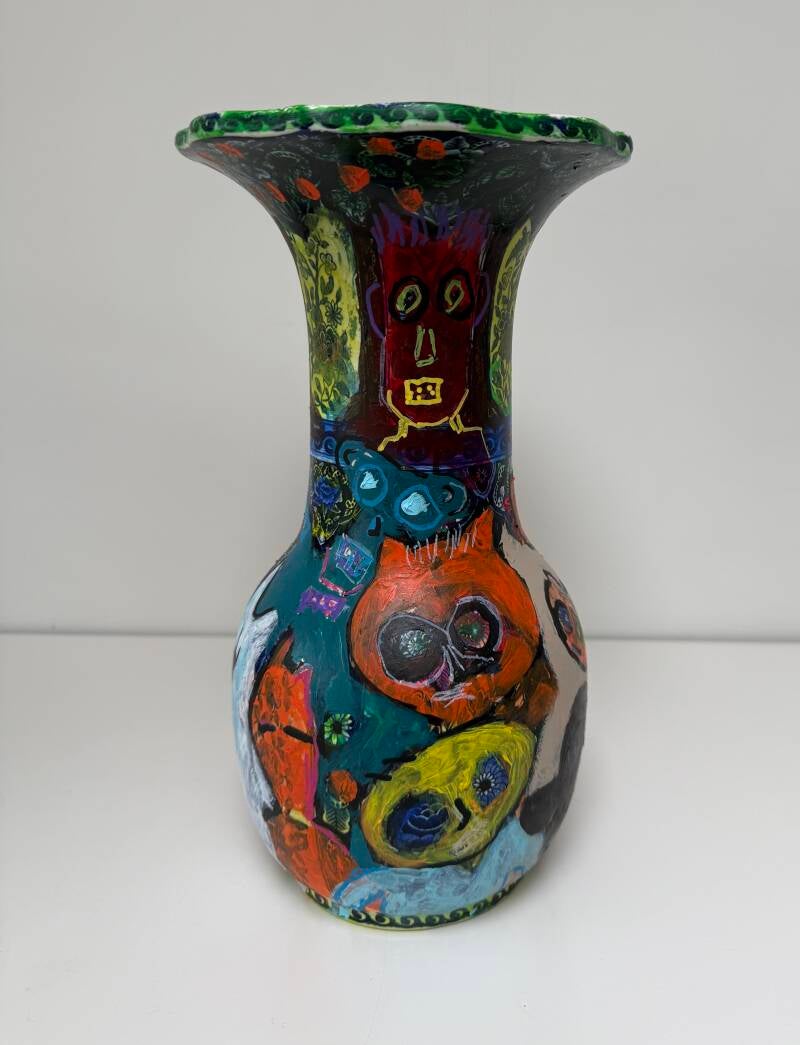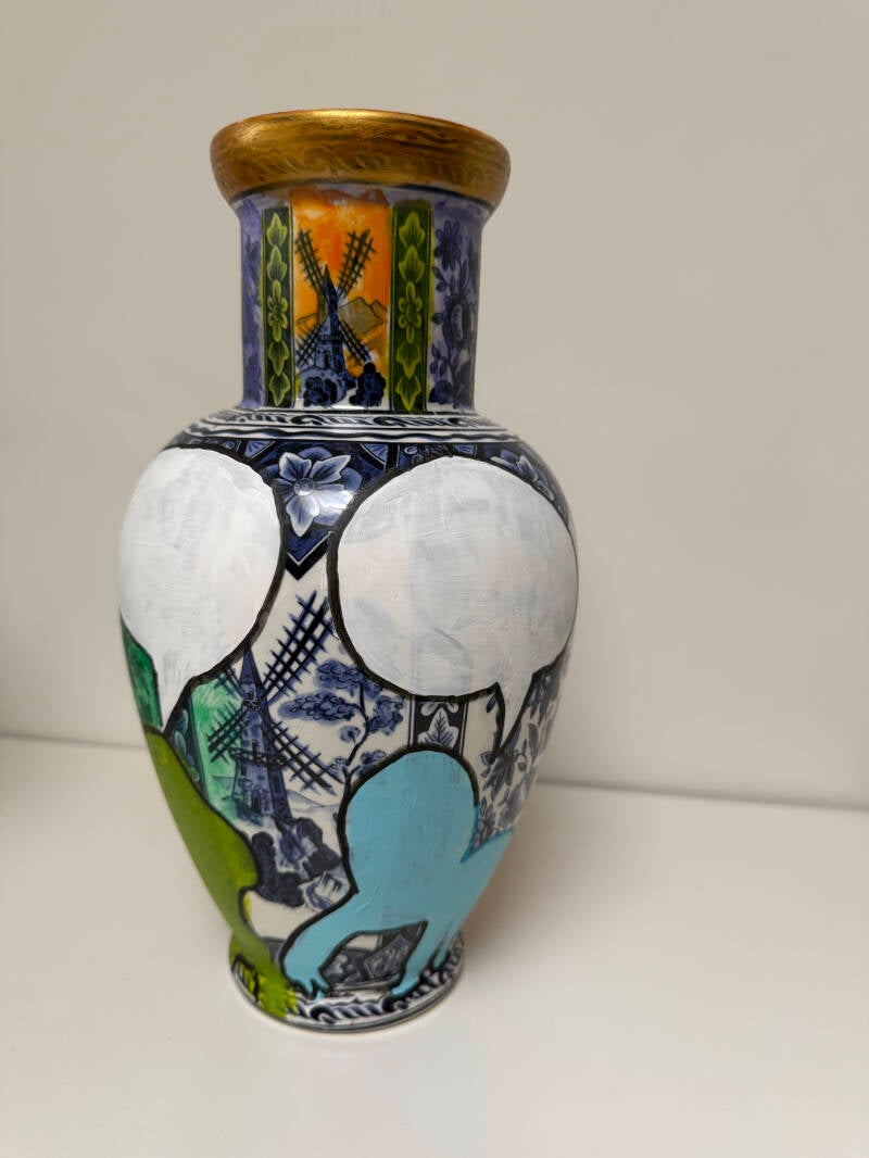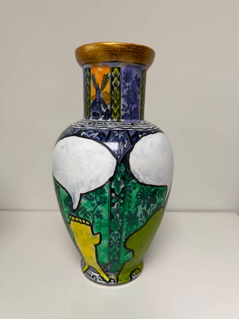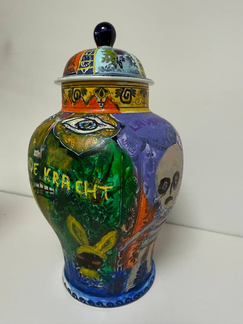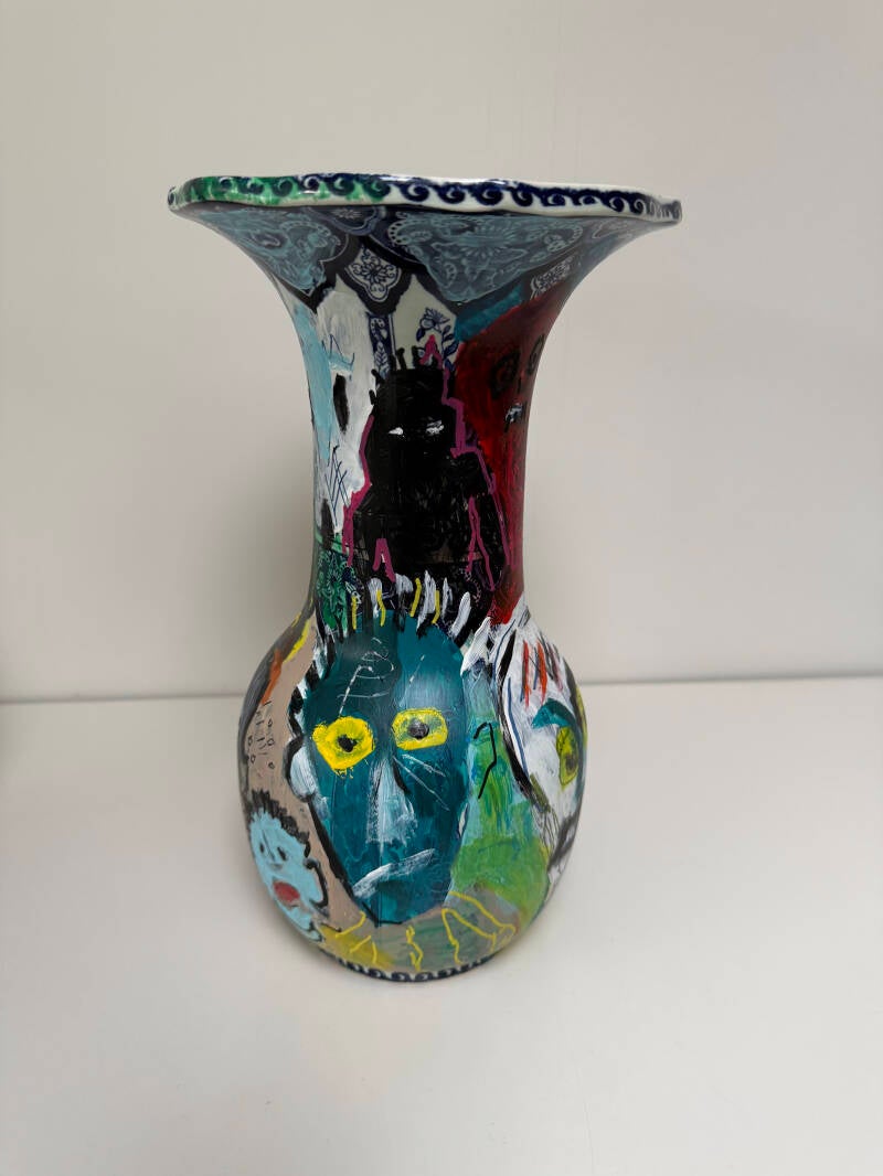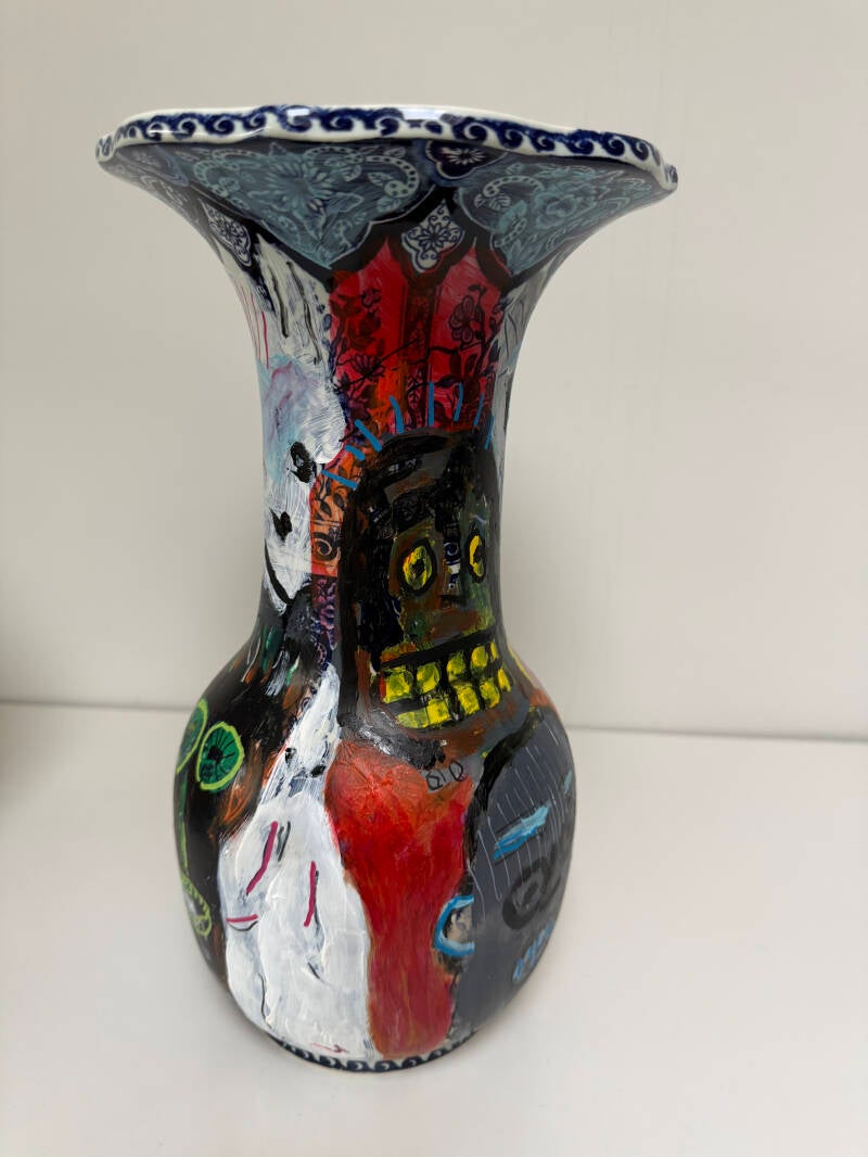 Met mijn recente werk laat ik het realisme los en experimenteer ik met een nieuwe, meer associatieve stijl. Ik combineer dit met het overschilderen van Delfts blauwe vazen in dezelfde stijl en met op Basquiat geïnspireerde wezens. De vazen kunnen worden gezien als versterking/aanvulling van de schilderijen. Het maatschappelijk engagement blijft herkenbaar.